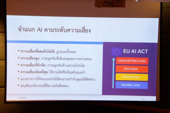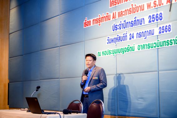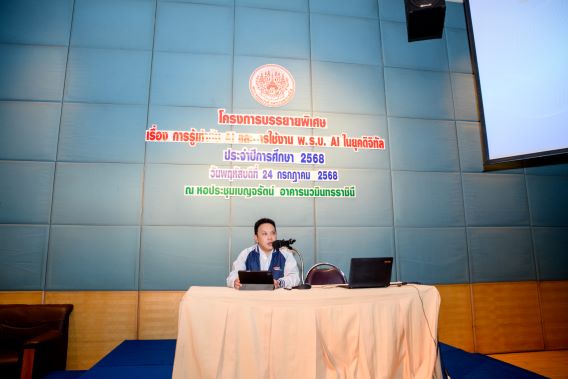 ผศ.ดร. สราวุฒิ สืบแย้ม ผู้ช่วยอธิการบดีฝ่ายการคลังและกิจการทั่วไป และประธานคณะกรรมการศูนย์คลังข้อมูลกฎหมายการศึกษาและอุตสาหกรรม กองกลาง สำนักงานอธิการบดี มหาวิทยาลัยเทคโนโลยีพระจอมเกล้าพระนครเหนือ (มจพ.) เป็นประธานเปิดการบรรยายพิเศษในหัวข้อ เรื่อง “การรู้เท่าทัน AI และการใช้งาน พ.ร.บ. AI ในยุคดิจิทัล” ประจำปีการศึกษา 2568 ในวันที่ 24 กรกฎาคม 2568